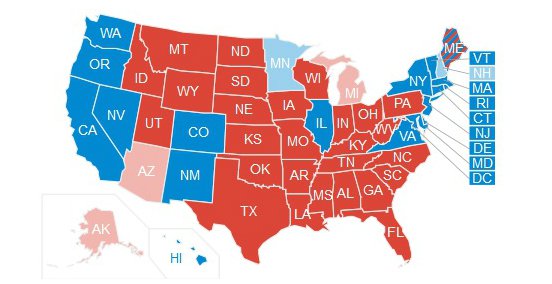 Otra vez, como pasó en 2000, un candidato ganó en el voto popular, pero el otro en la composición del Colegio Electoral. La ventaja de Clinton en las ciudades grandes no obtuvo recompensa equivalente en los electores.